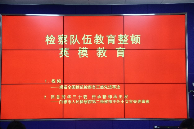 开展英模教育,观看全国模范检察官王盛先进事迹,学习白银市人民检察院第二检察部主任王立言的先进事迹。开展警示教育,学习违纪违规、违反“三个规定”的典型案例。