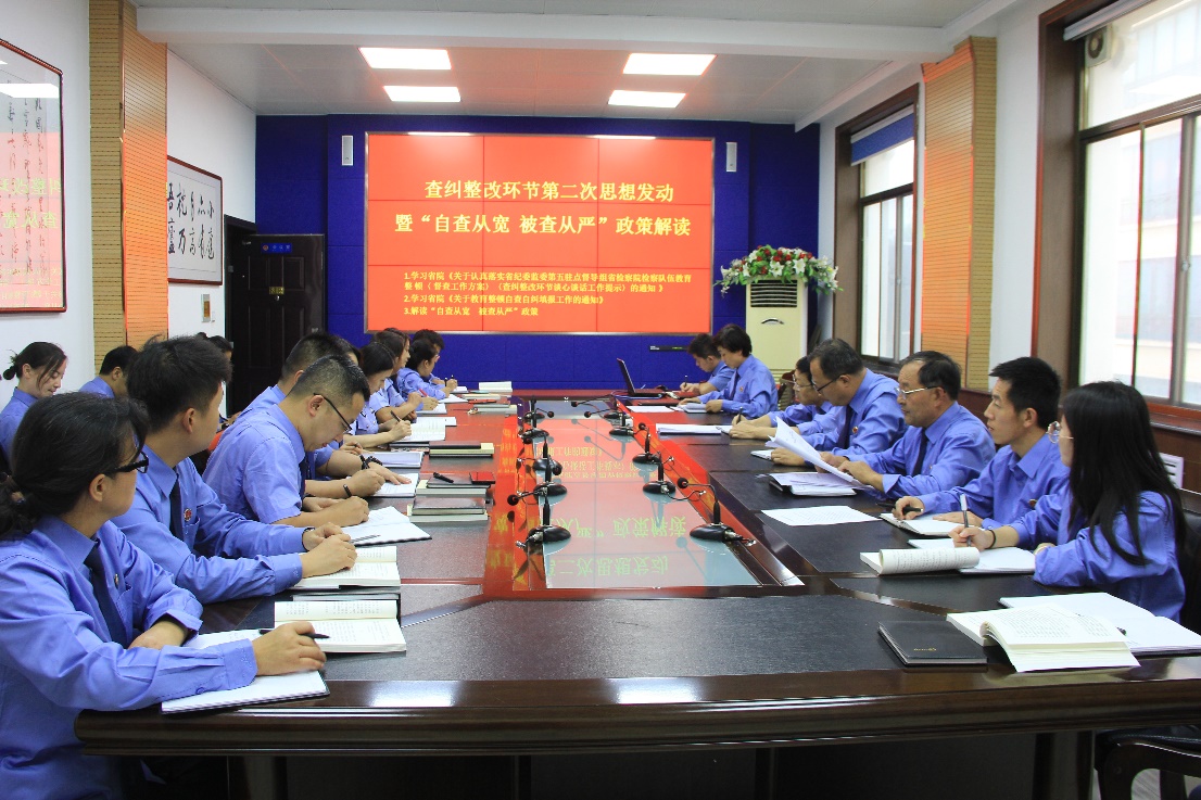 会上,党组成员、纪检委员吴新峰组织学习了省院《关于认真落实省纪委监委第五驻点督导组省检察院检察队伍教育整顿<督查工作方案><查纠整改环节谈心谈话工作提示>的通知》和省院关于《关于教育整顿自查自纠填报工作的通知》,并对“自查从宽,被查从严”政策的指导思想、适用人群、适用期限、以及自查的认定和被查的处理等政策进行了详细解读。